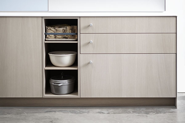 The storage area should be located close to the prep and cook space for ease of movement. It is used to store pantry items, pots and pans, as well as refrigerated and frozen food. Typical store areas are tall pantries, however you can also use base storage drawers to hold dry goods and small appliances.