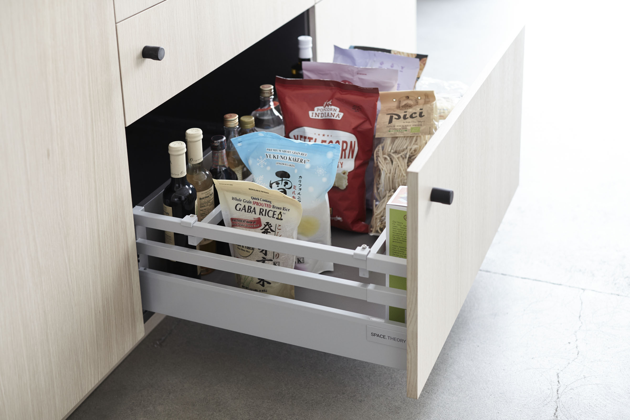 Drawer slides and rails are light gray, powdercoated steel which is more durable, functional, and operate more smoothly than wood drawers. Cross rails in drawers provide storage for pan lids or to divide storage space.
