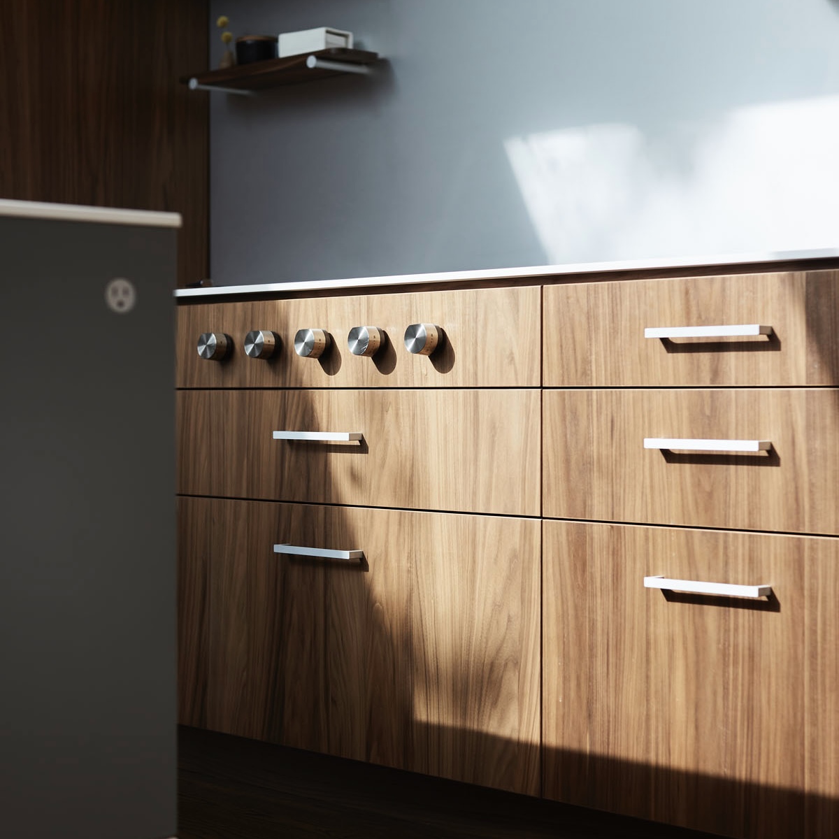 Space Theory cabinets are made from ¾” veneer core domestic plywood, constructed by hand, doweled, glued and screwed. The result is a structural cabinet that is very strong and easy to install. Even the backs are ¾” plywood. Base and tall units come with levelers installed and connector bolt fittings for joining them together, which helps assure a quality installation.